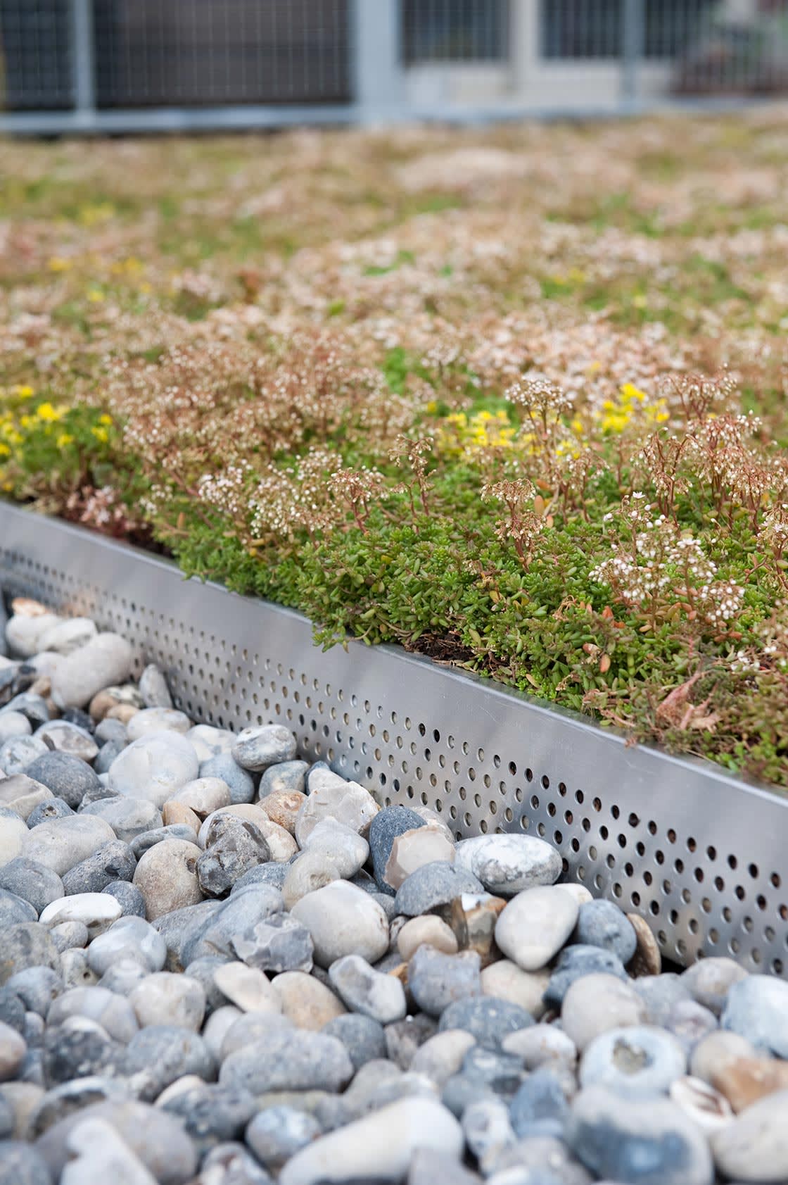Aan de randen werd een steriele zone aangelegd met rolgrind. Hoogwaardige aluminium randprofielen zorgen voor de afscheiding tussen het groendak en de omliggende steriele zone.